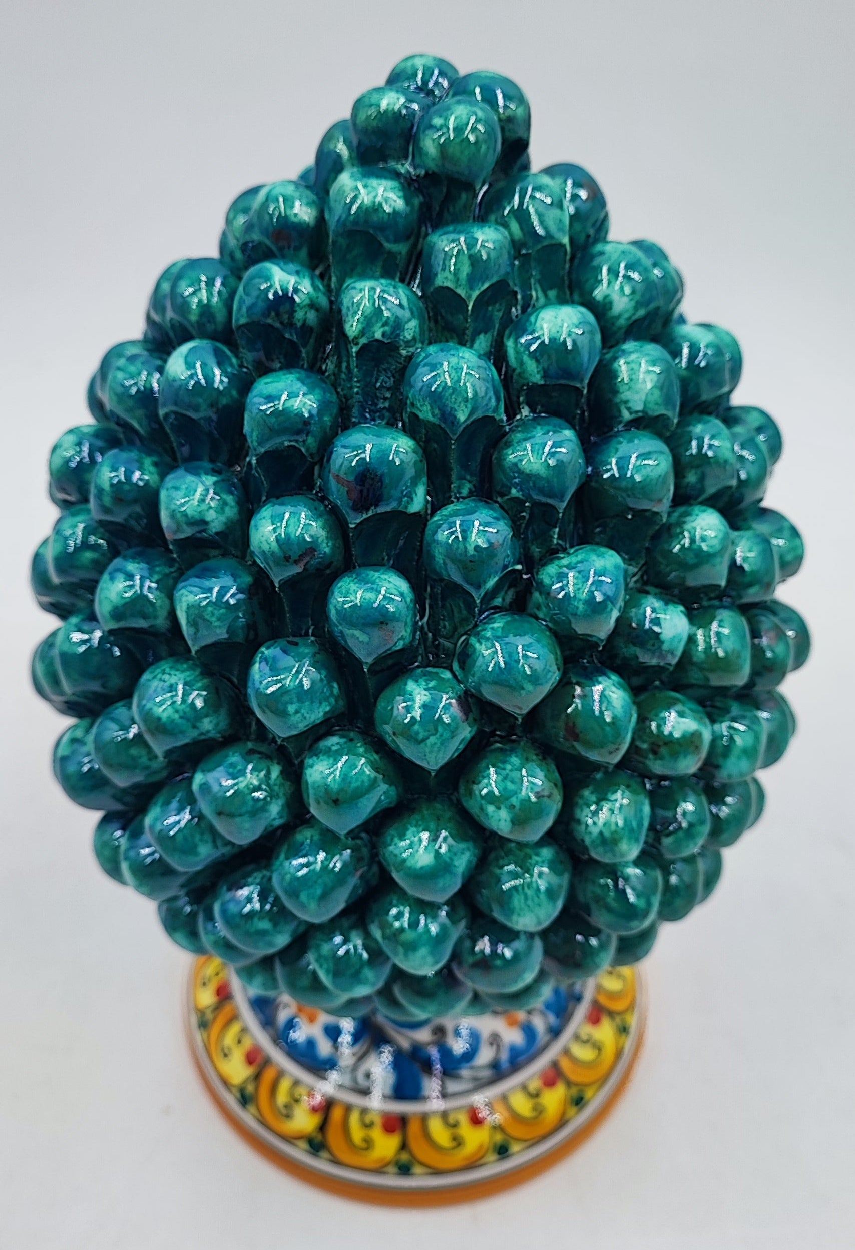 The Caltagirone ceramics are famous for their long-standing tradition of creating beautifully crafted and vividly colored ceramic pieces. The Pine Cone (Pigna) is one of the most iconic items produced in this tradition, symbolizing good fortune and prosperity.