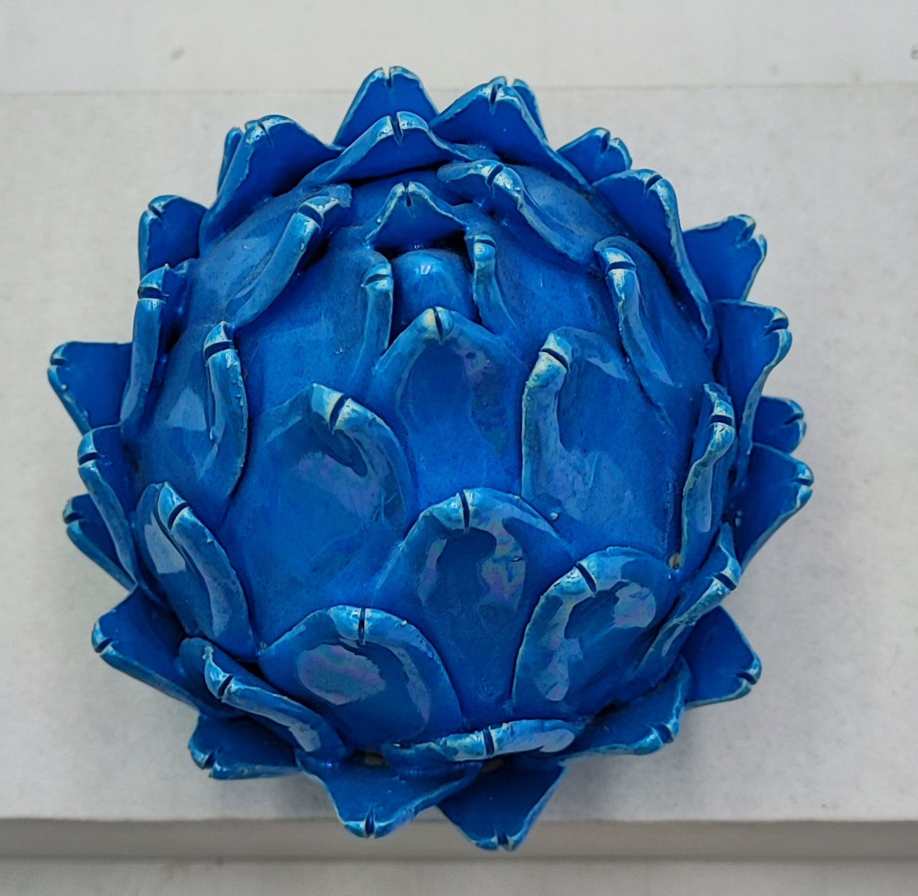 Celebrate Sicilian artistry with this stunning Caltagirone ceramic artichoke, handcrafted and glazed in a radiant mother of pearl finish. Symbolizing prosperity and warmth, the artichoke is a traditional decorative element in Sicilian homes—now reimagined in a luminous glaze that captures and reflects light beautifully.