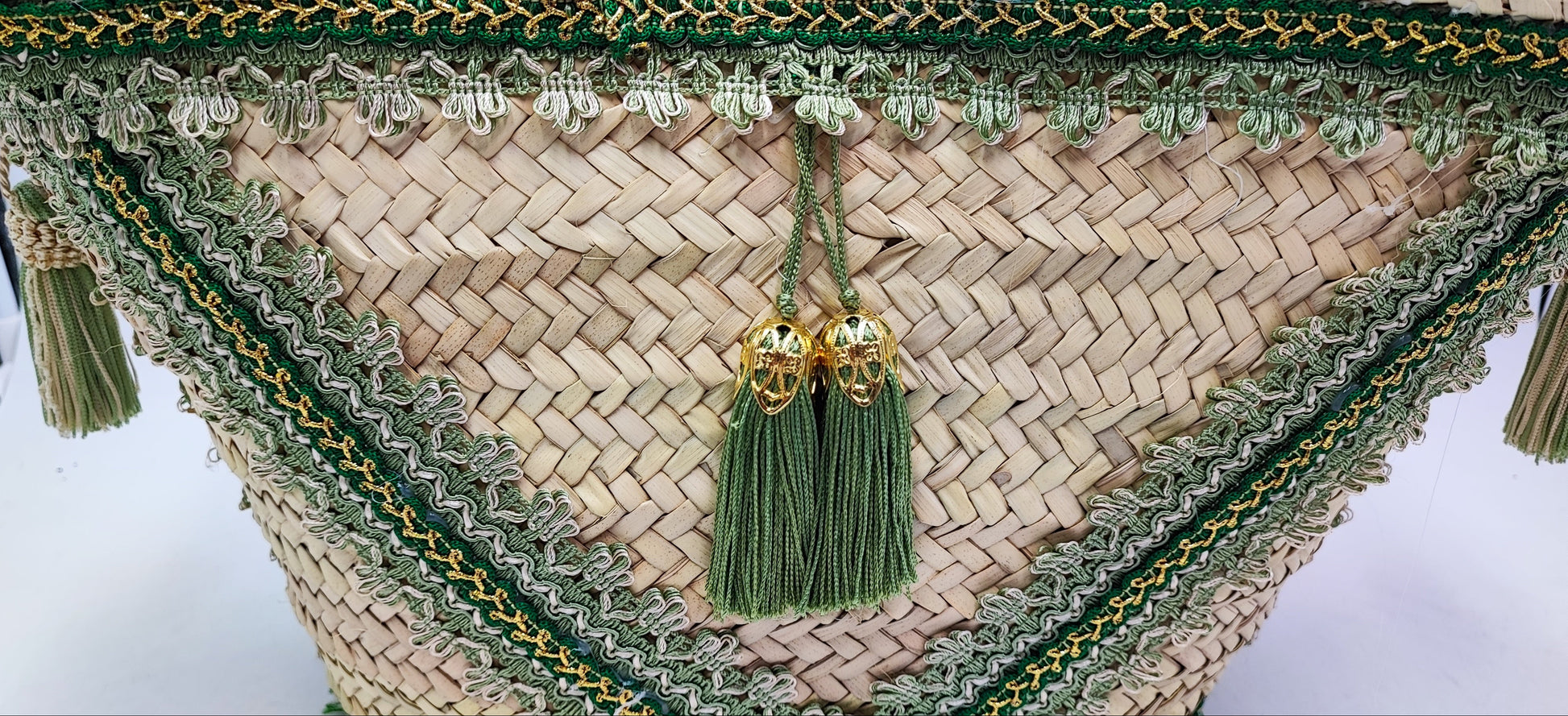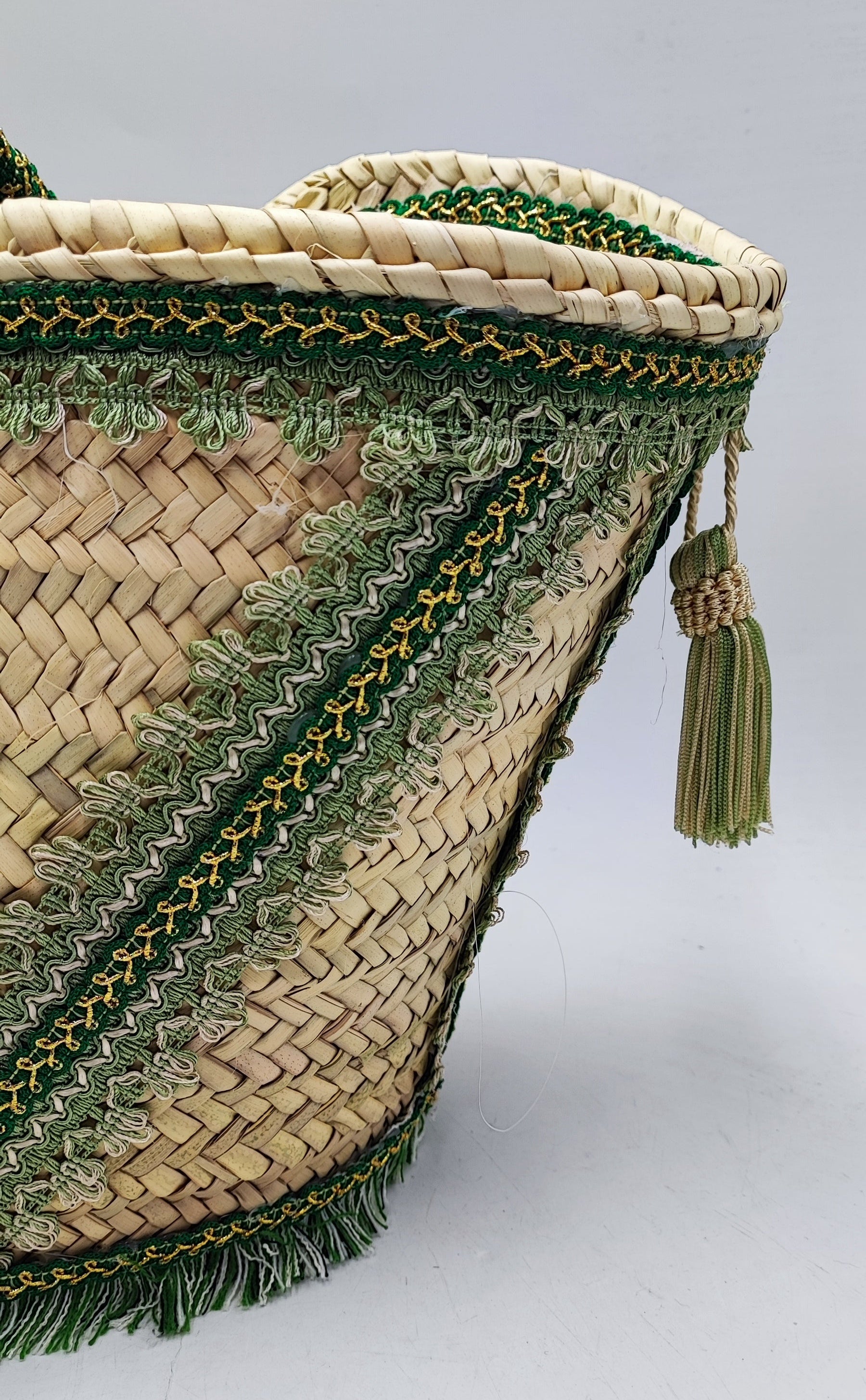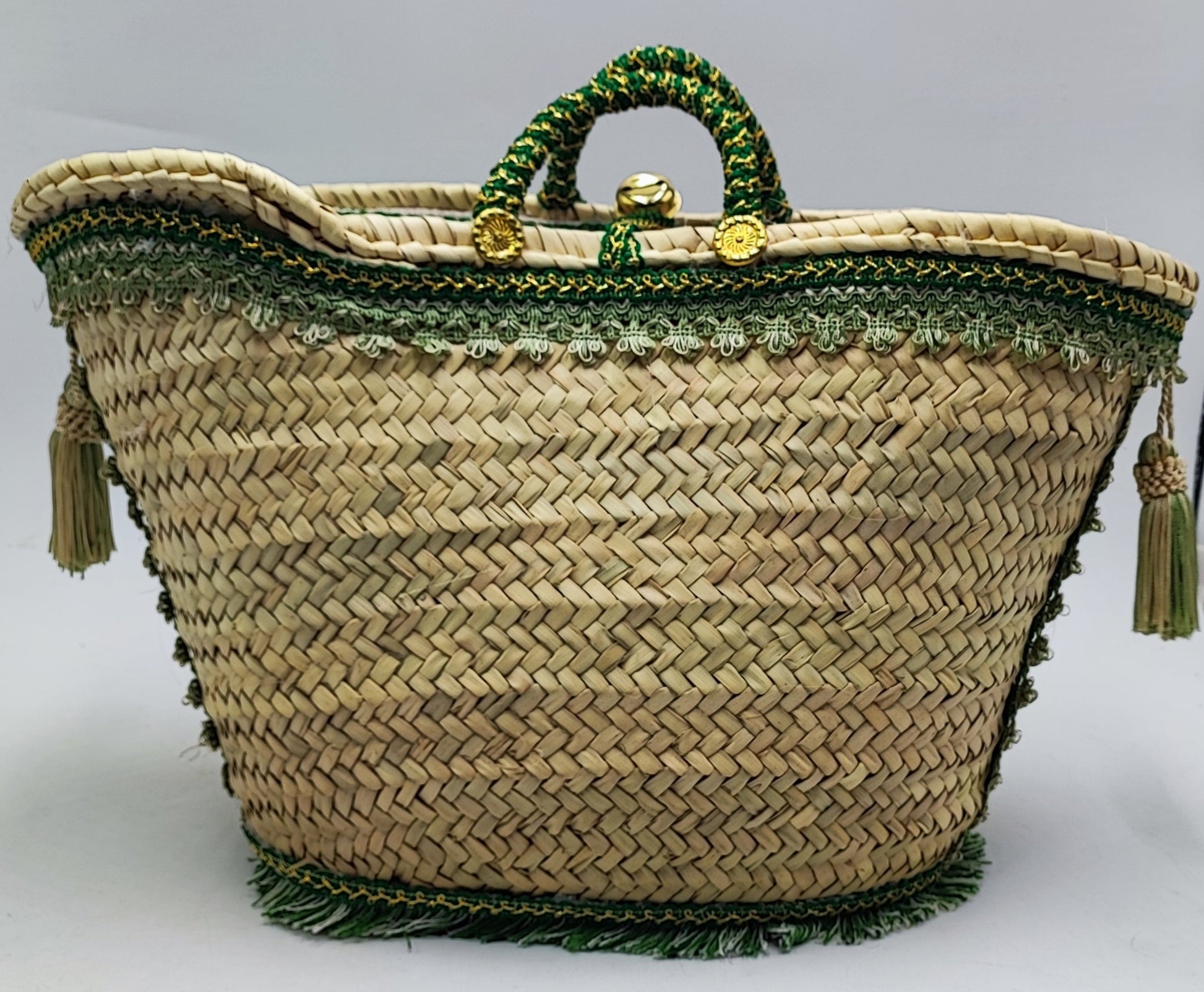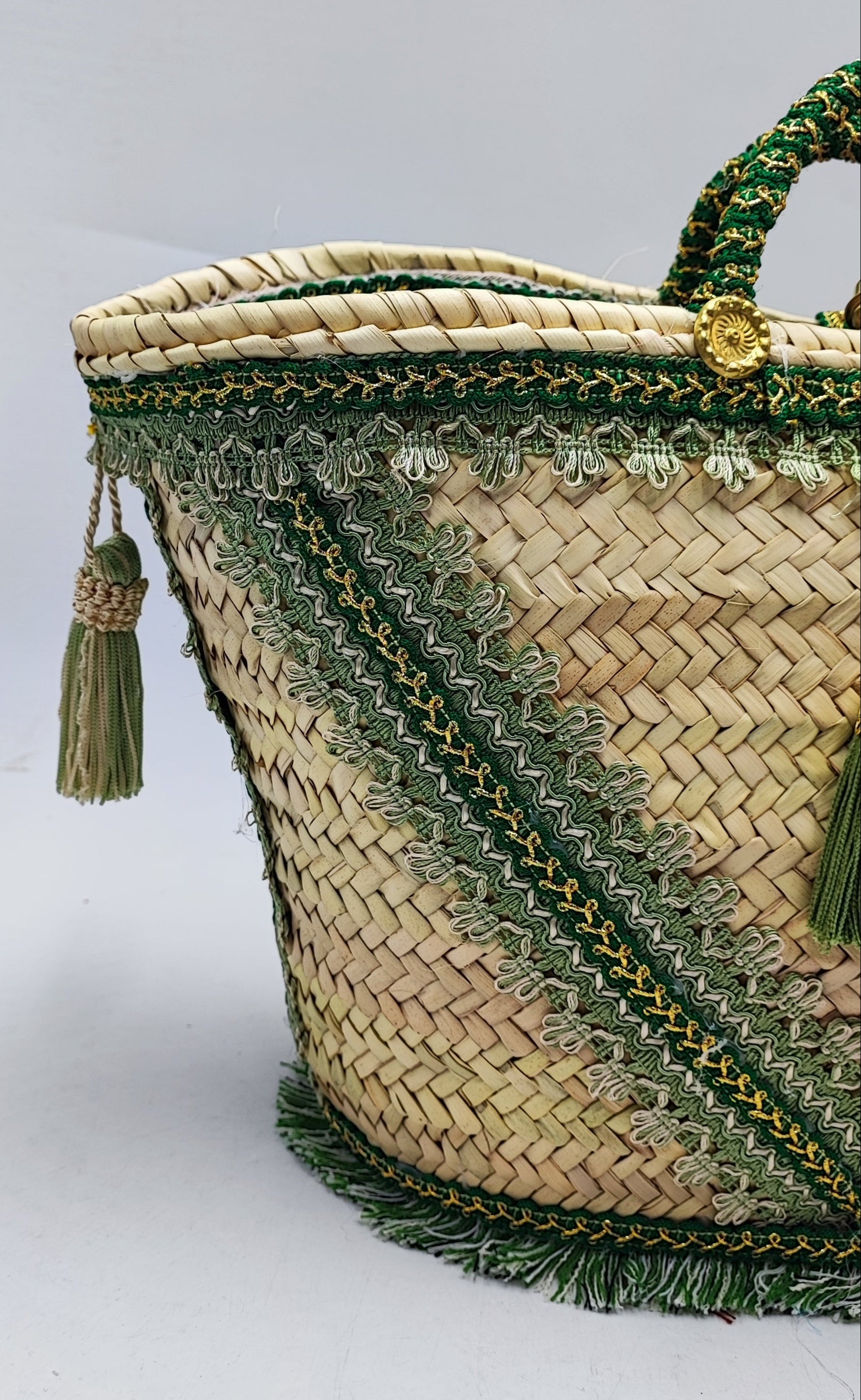 Immerse yourself in the charm of Sicilian craftsmanship with this exquisite handwoven straw bag — a one-of-a-kind creation inspired by the timeless traditions of Southern Italy. Each piece is meticulously handmade using natural palm fibers and adorned with elegant green trimmings, ornate braiding, and luxurious tassels. Perfect for seaside getaways, summer strolls, or as a standout boho accessory, this large tote captures the spirit of Mediterranean style with a refined, artisanal touch.