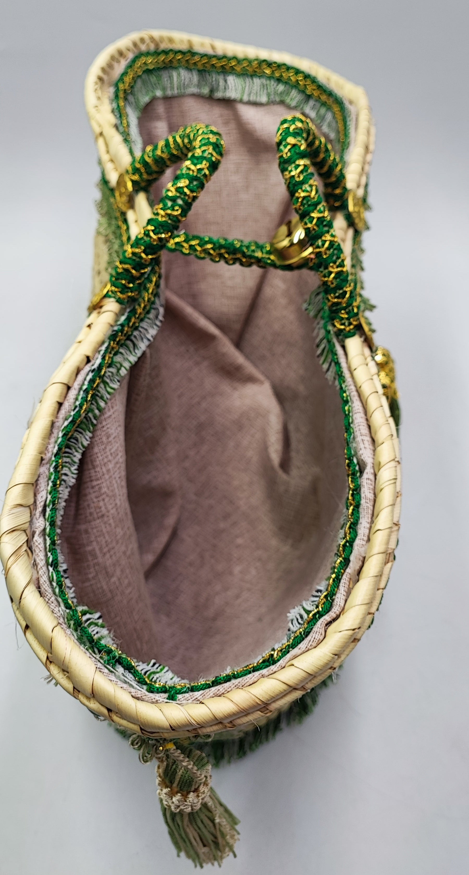 Handwoven Sicilian Straw Bag with Green Tassels | 49 cm x 30 cm (19.3” x 11.8”) | Large Handmade Beach Tote | Italian Boho Summer Basket Bag